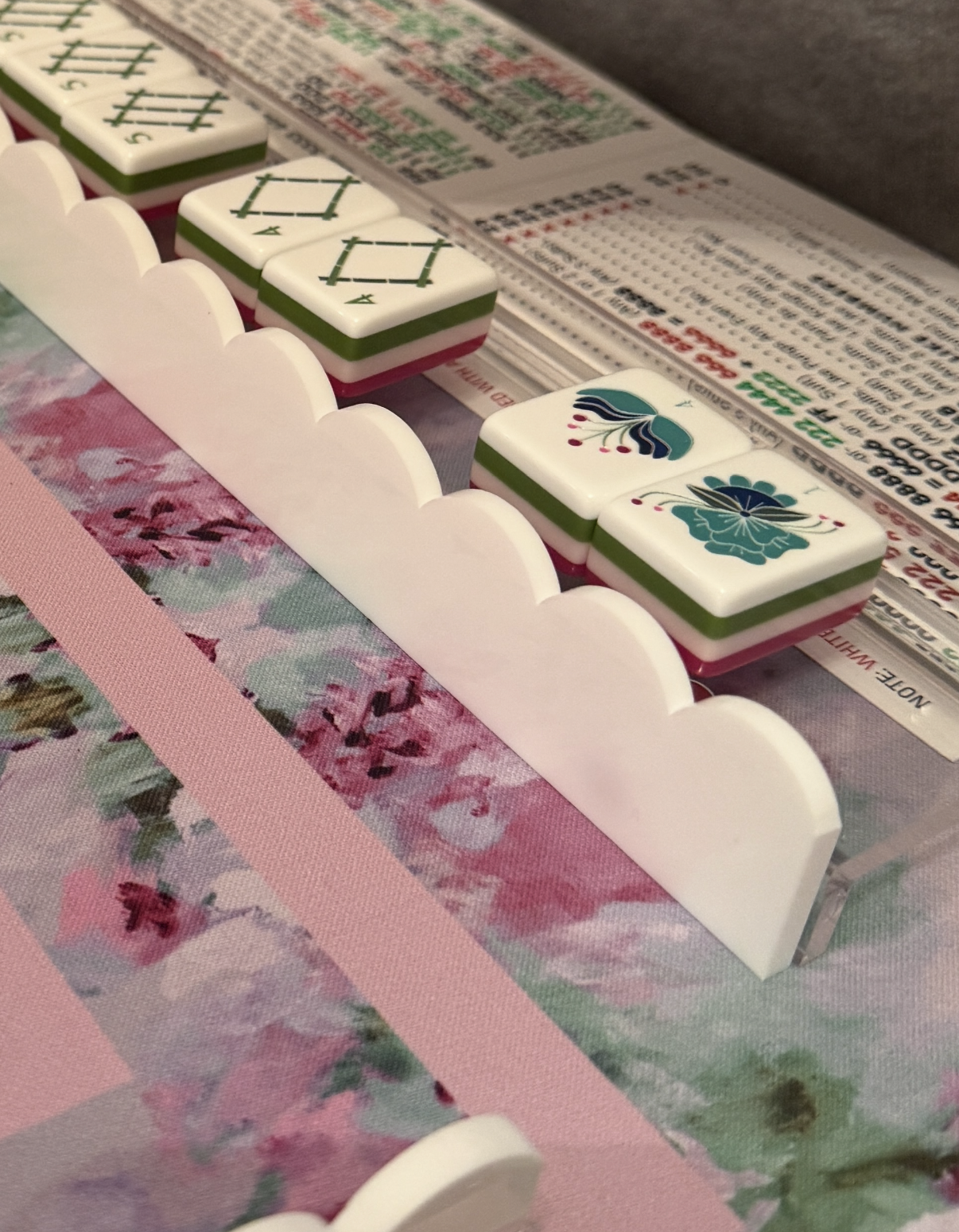 I got the Mahj Mood clear acrylic racks with the white scallop pushers and oh honey, there is nooooo going back. Add this to the list of things I didn’t know I needed and now I can’t live without. The white scallop pushers are classy and look fantastic against all of my mats. The acrylic is STURDY and has weight to them, unlike my original hinged set. I love that Mahj Mood sells different scalloped and straight-edged pushers that are interchangable with their racks. It’s an easy and affordable way to change the look of your table. I will also add that these racks are very high quality and a fraction of the price of other mahjong racks/pushers.